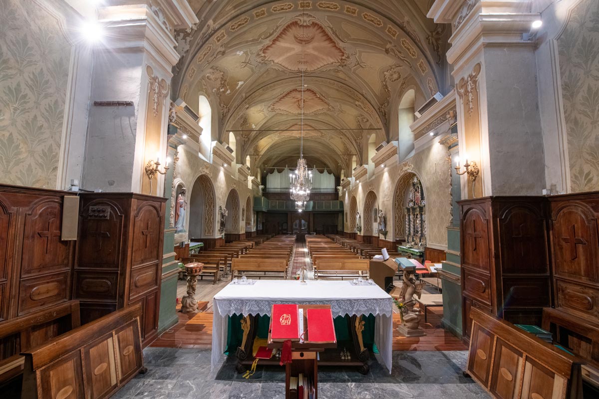 Son intérieur, de style baroque, abrite cinq autels datant de la première moitié du XVIIIe siècle : l'autel du Rosaire (1731), l'autel de la Pietà (1730), l'autel de Saint-Michel (1725) et l'autel de Saint-Antoine (1719). Le maître-autel, datant de 1712, est l'un des exemples les plus importants du baroque en Vallée d'Aoste. Un orgue fut acheté en 1791, ensuite restauré en 1872 et 1969. Au début du XXe siècle, les dons ont permis la restauration et l'amélioration de l'église, y compris de nouveaux bancs. Entre le XIXe et le XXe siècle, quelques statues ont également été ajoutées le long de la nef. En 1906, la façade fut restaurée avec des fresques.