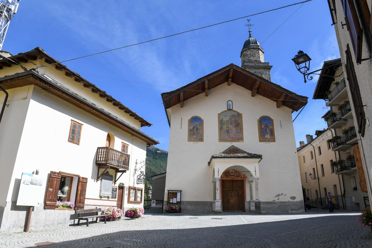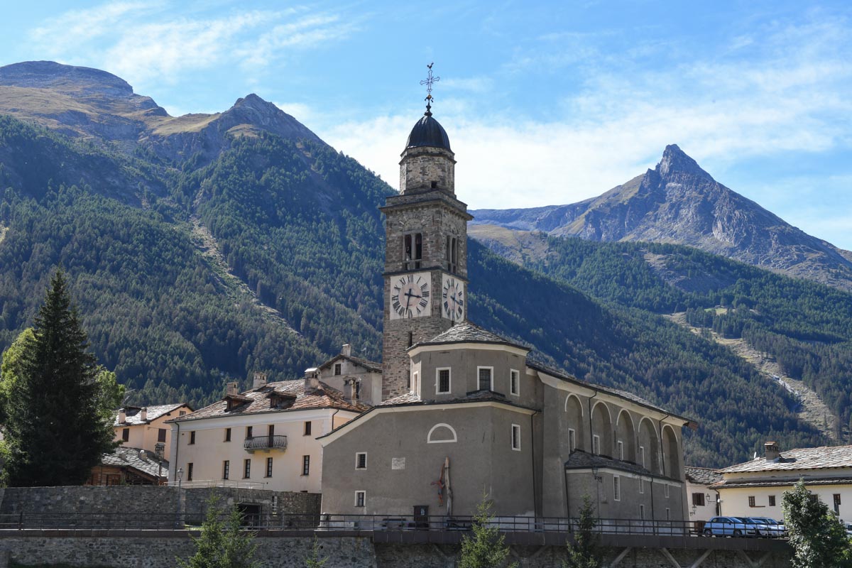 L'église dépendait de la collégiale Saint-Ursin d'Aoste, permettant aux curés d'être également chanoines de Saint-Ours pendant six siècles (1184-1820). Le bâtiment a subi plusieurs changements et, au Moyen Âge, n'abritait que deux autels : un maître-autel dédié à Saint-Ours et un à la Vierge Marie. Une inondation désastreuse en 1640 provoqua l'effondrement de l'église du XIIIe siècle, ce qui a entraîné la construction du bâtiment actuel.