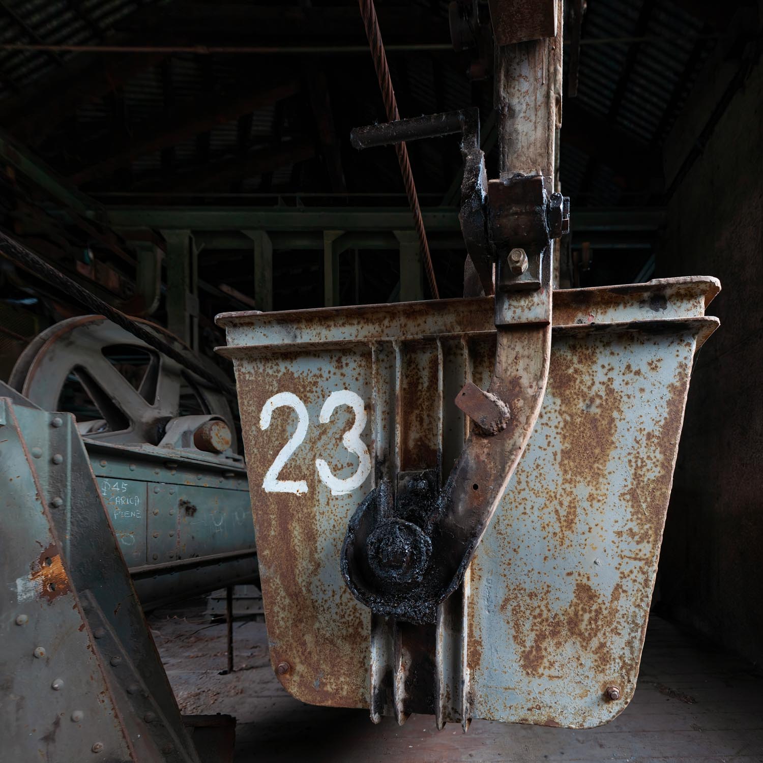 Stazione di arrivo della teleferica e una benna di carico del minerale.